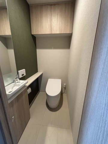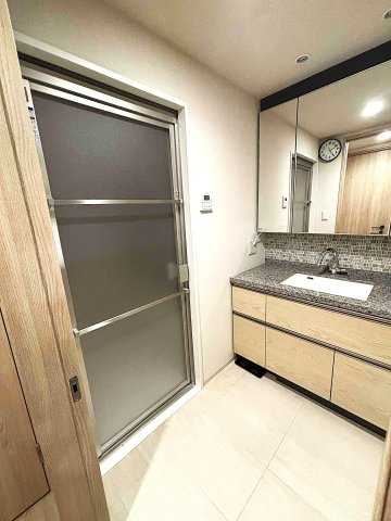 タカギタッチレス水栓に交換しています。チャイルドミラー部分にタイルを貼付しています。